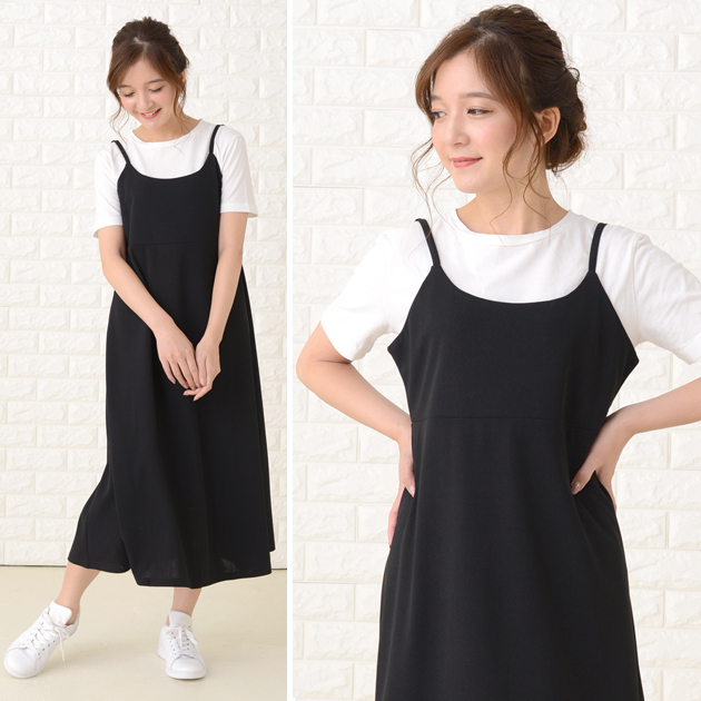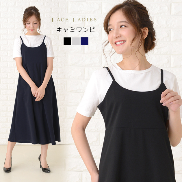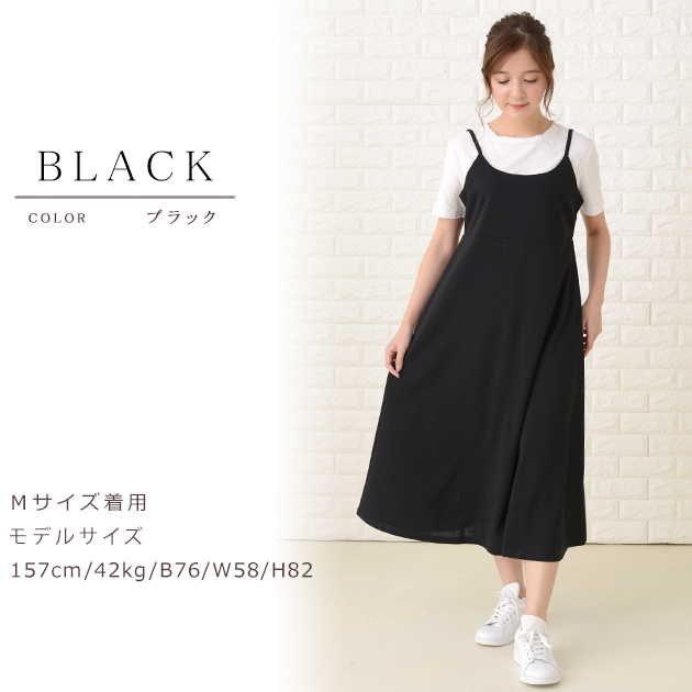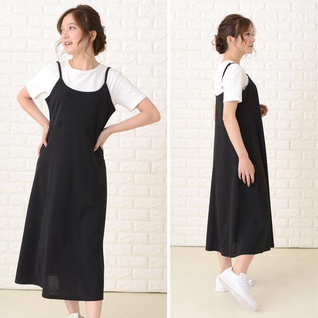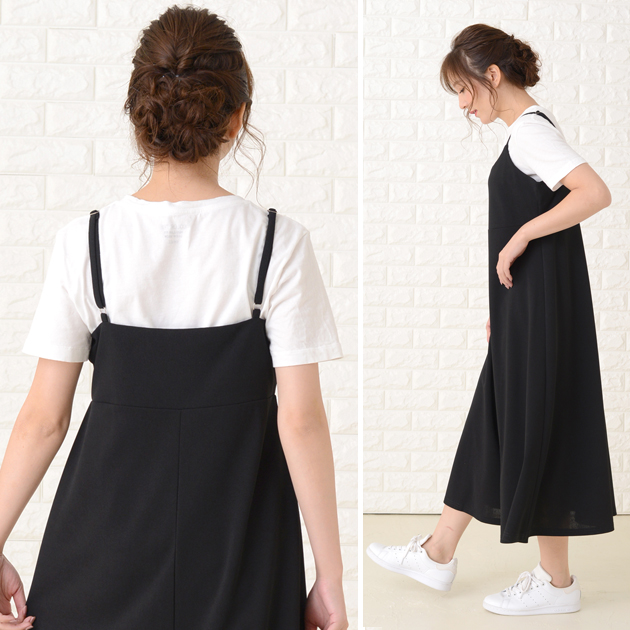 上品な黒のキャミワンピースで、ゆったりとしたシルエットが体型カバーに最適です。