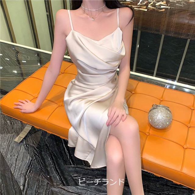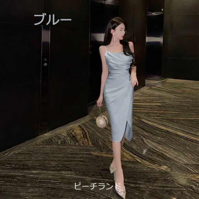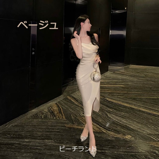 エレガントなキャミワンピースで特別な夜を演出 ベージュとブルーの2色展開で、タイトなシルエットが美しいボディラインを引き立てます ノースリーブデザインで洗練された大人の魅力を表現 パーティーや夜のお出かけに最適な一着です