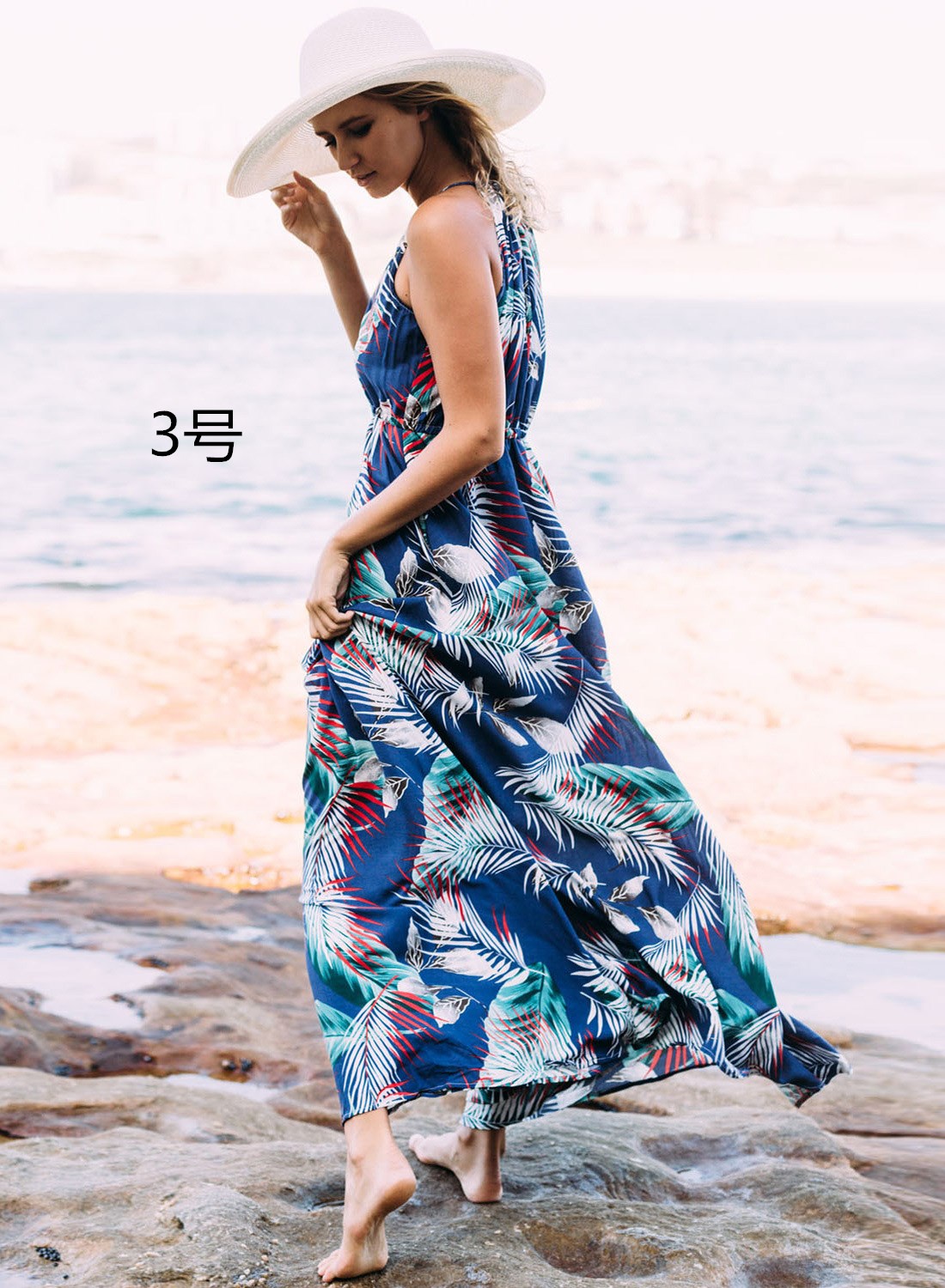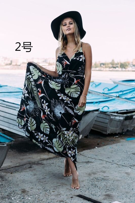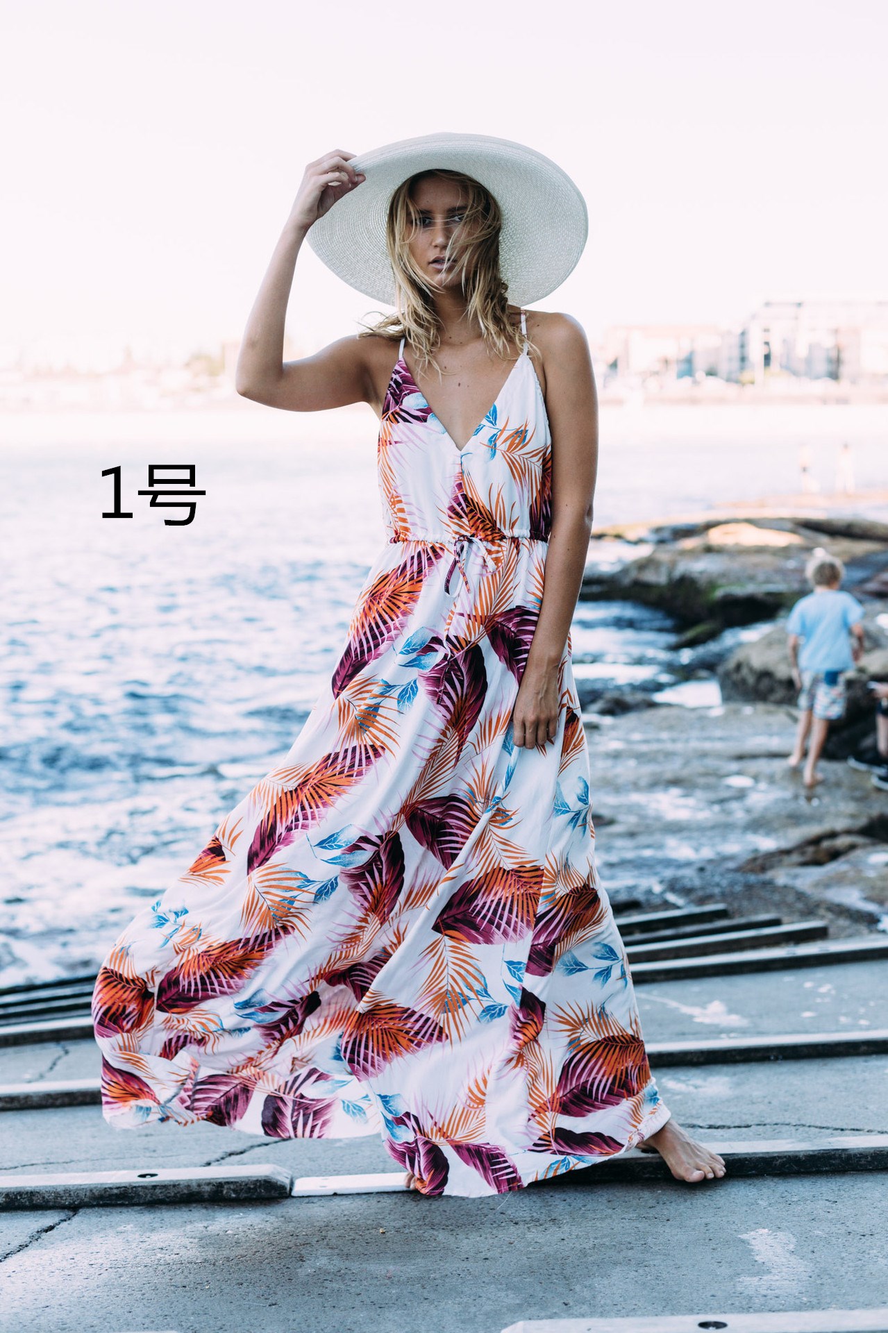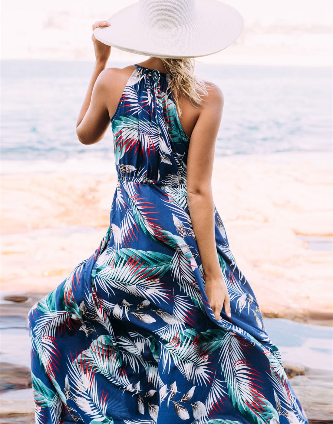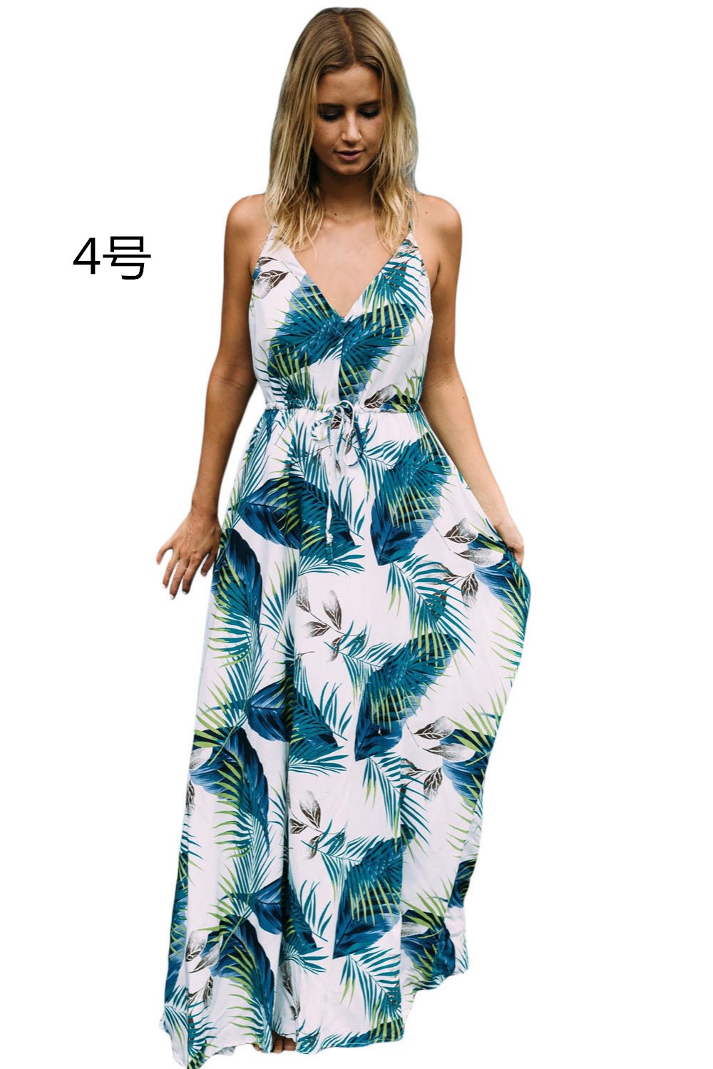 白地にヤシの葉プリントが美しいキャミワンピース。南国風の上品なボタニカル柄でビーチや旅行先にぴったり。