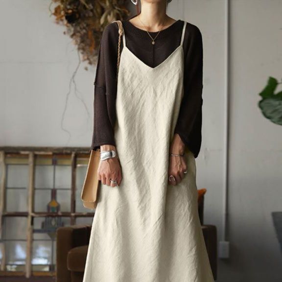 細めの肩紐とゆったりとしたシルエットで体型をさりげなくカバーし、リラックス感のある雰囲気を演出します。