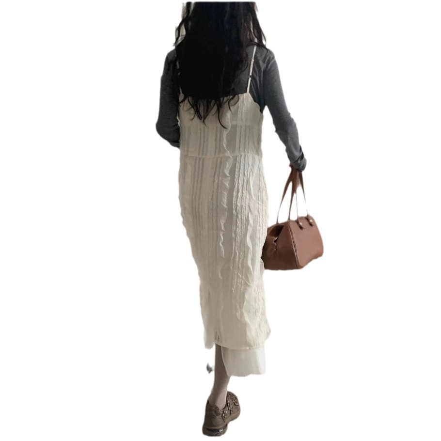 細めの肩紐が華奢な印象を与え、タートルネックやロングスリーブとの組み合わせで季節を問わず楽しめます。