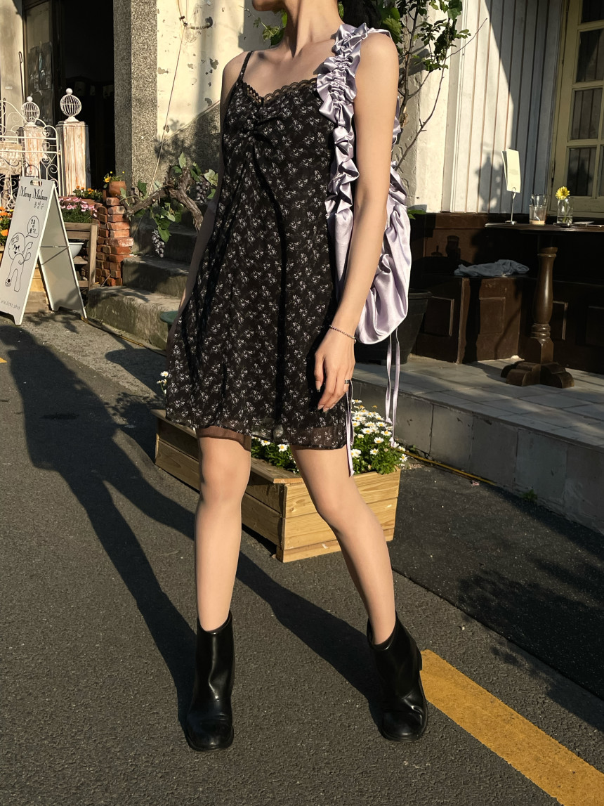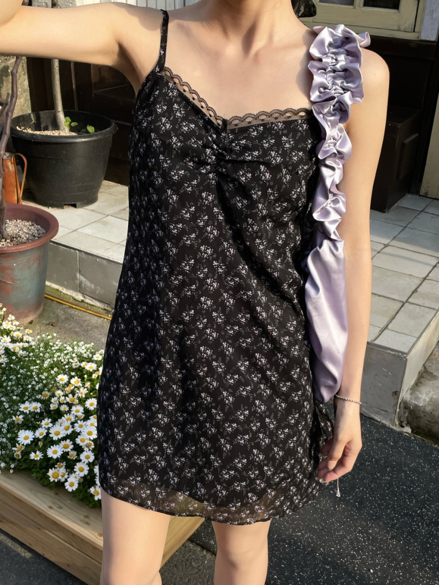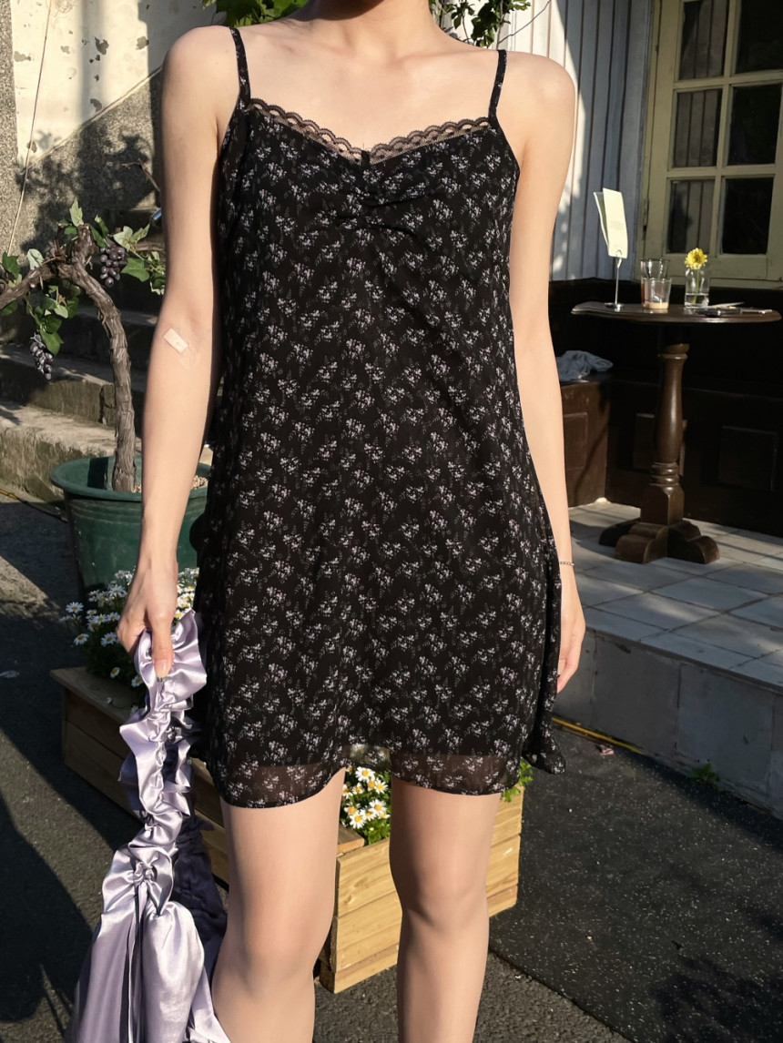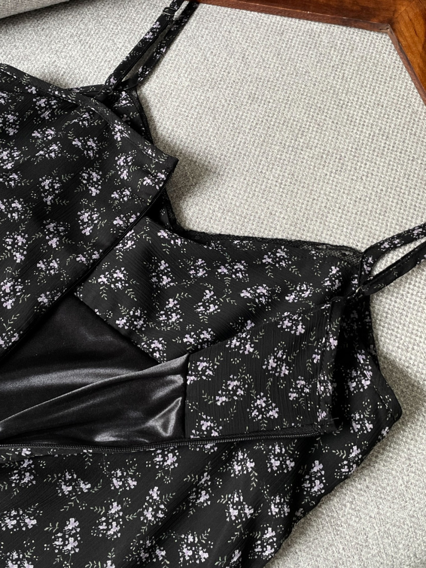 快適な着心地を提供するコットンとポリエステル素材の黒地花柄キャミワンピース。